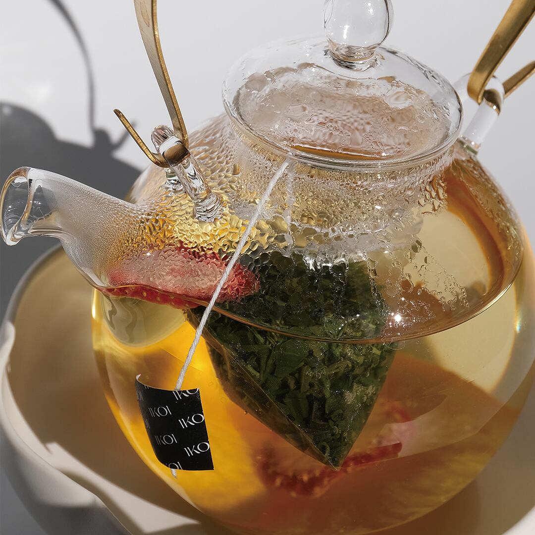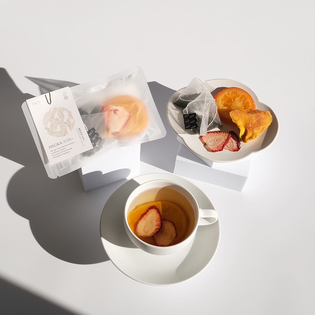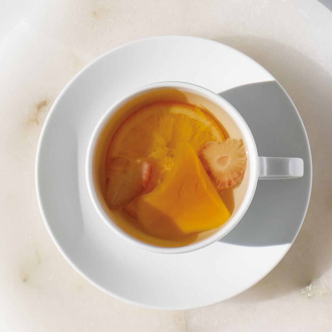 佐賀県嬉野産の釜炒り茶に、ドライフルーツの完熟マンゴー・オレンジ・苺を合わせました。釜炒り茶の澄んだ味わいに果実の甘い香りが重なる、華やかなフルーツティーです。